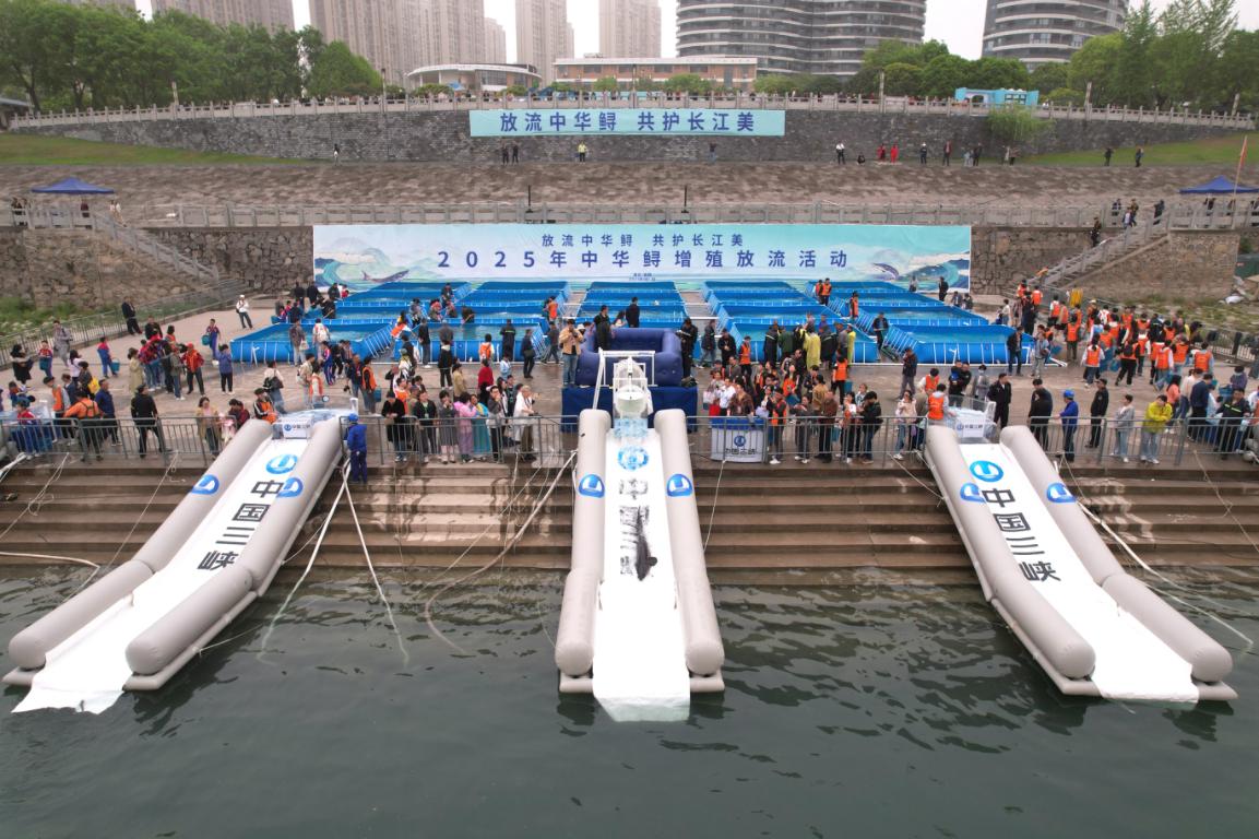 ▲2025年4月12日在湖北宜昌举行的中华鲟增殖放流活动现场 摄影:陈臣