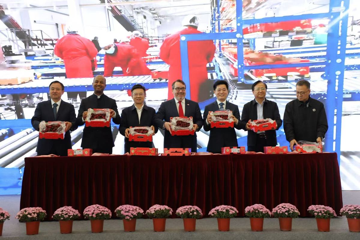 在首航活动上,湖北国际物流机场有限公司、顺丰航空有限公司分别与埃塞俄比亚航空集团签订了深化合作协议、空空中转联运合作协议,智利车厘子协会与中国(鄂州)跨境电商产业园签署了营销推广合作备忘录。鄂州市政府领导、智利驻华大使共同为“智利水果物流枢纽基地”揭牌,标志着花湖机场将成为智利水果进入中国的重要门户。湖北省商务厅、湖北省国资委、鄂州市政府、智利驻华大使馆、民航湖北监管局、湖北机场集团、埃塞俄比亚航空、顺丰速运、鄂州花湖机场及多家车厘子贸易商代表共同见证这一“甜蜜时刻”。