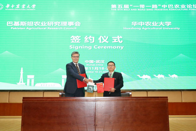 开幕式上,华中农业大学分别与巴基斯坦农业研究理事会、费萨拉巴德政府学院大学签署合作协议。随后,"武汉市(中国-巴基斯坦)园艺作物种质创新与利用‘一带一路’联合实验室"正式揭牌。