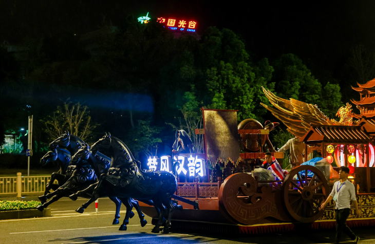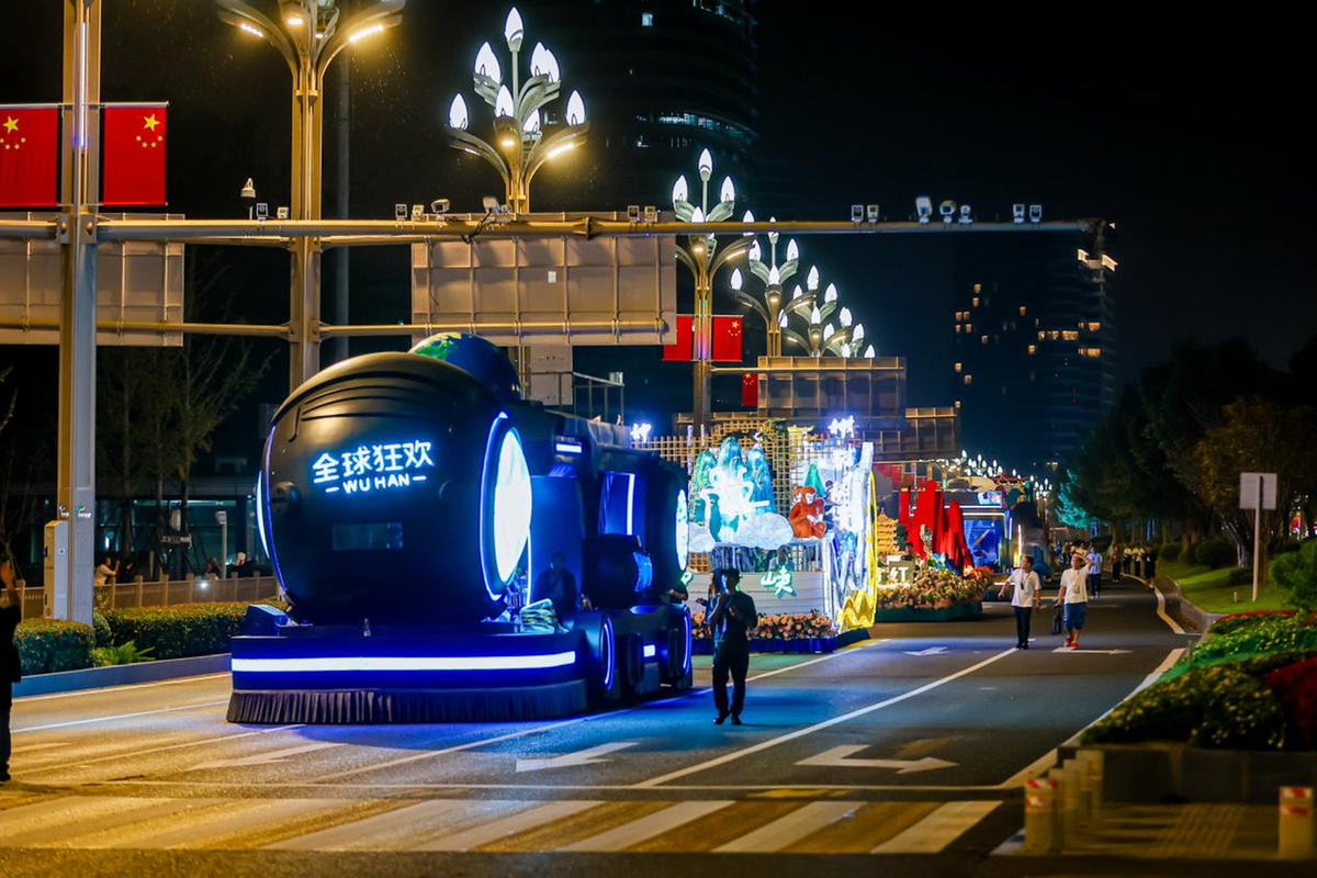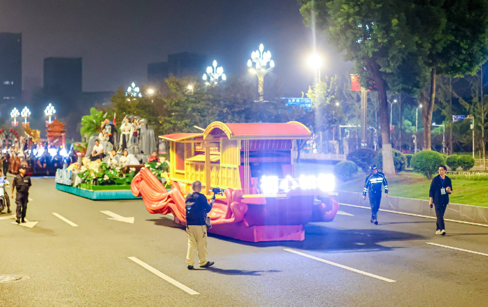 车轮滚滚,光影交织,花车在夜幕下如梦似幻地前移,构成一幅流动的“江城锦绣图”。演员们神采奕奕,舞步铿锵,与LED灯饰同步律动,传统楚风与现代科技在此刻完美交融。沿路工作人员严密调度,对花车定位、演员上下车、各环节衔接等每一个细节,进行反复校准,确保10月1日当天演出流畅震撼、万无一失。