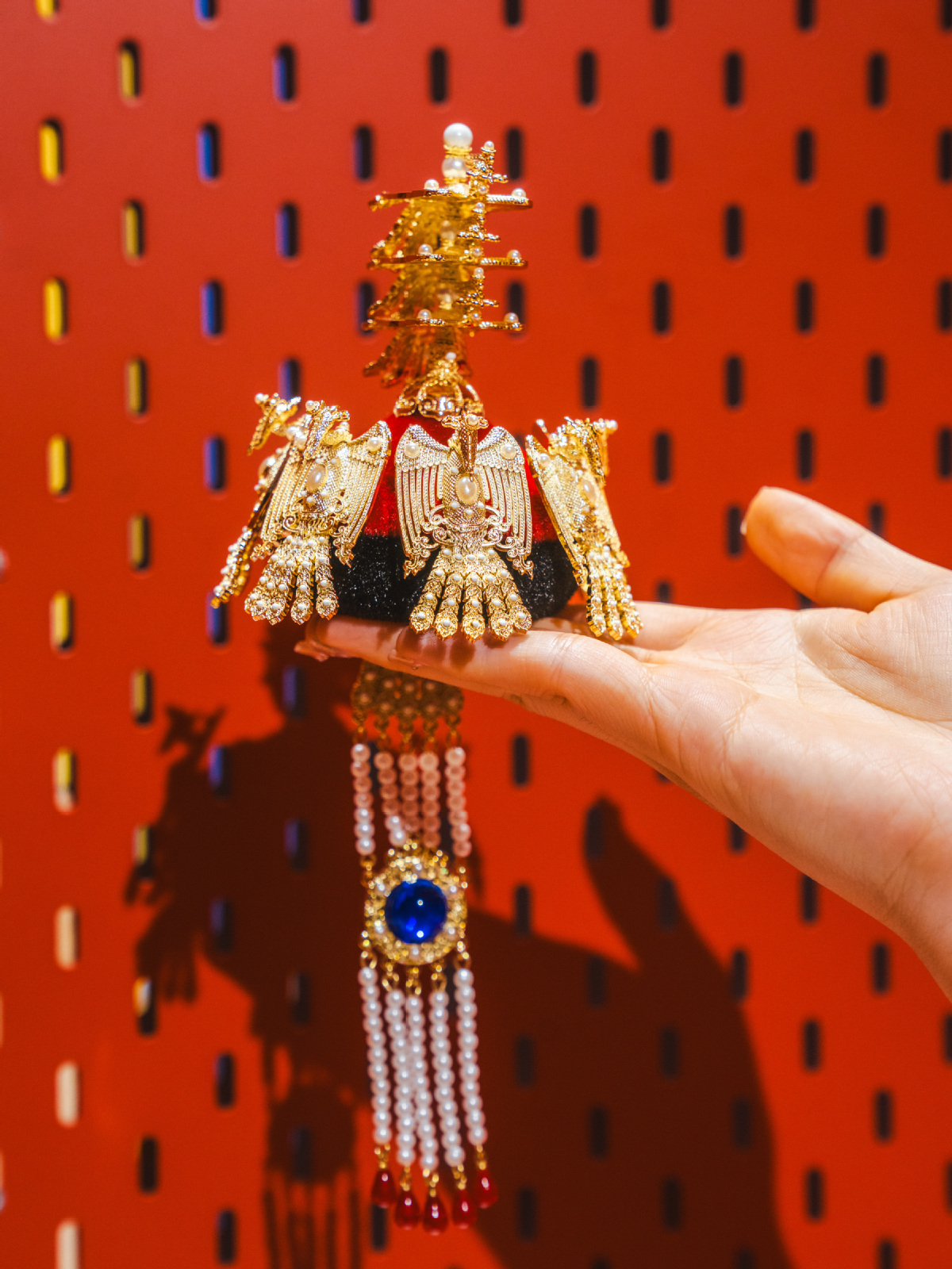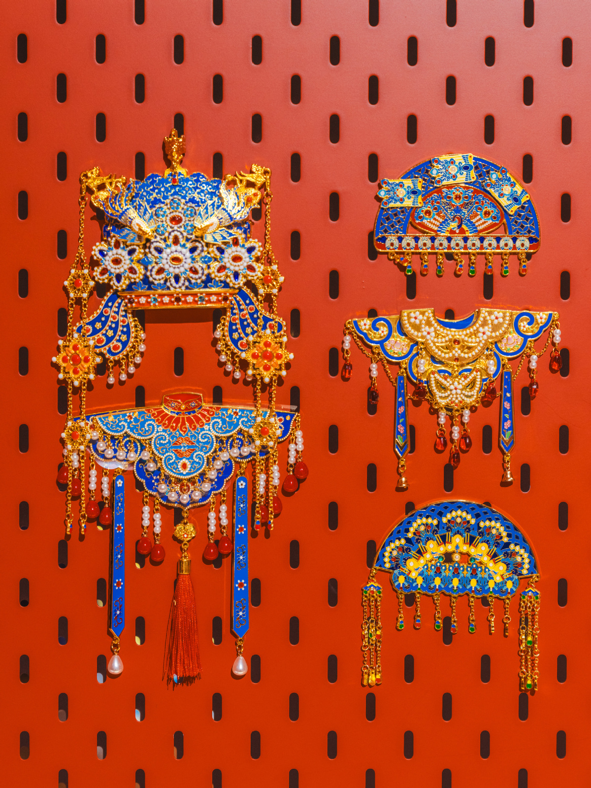 记者观察,故宫博物院的凤冠、霞帔冰箱贴,中国国家博物馆的凤啾啾凤团团玩偶、凤冠金属拼接玩具,湖北省博物馆的“一绾青丝”系列发簪,蒜鸟等文创都很受欢迎。