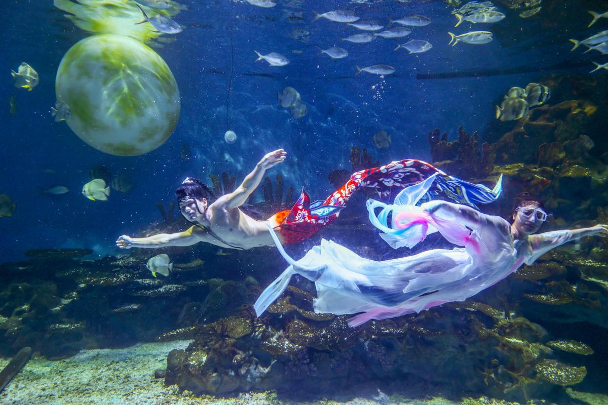 为打破“观光式体验”,度假区升级演艺内容,推出9大主题演艺产品,每日演出增至40余场。白天,《潮玩狂欢大巡游》中国潮服饰演员与游客互动,《国潮美人鱼》在水下演绎传统纹样与现代舞姿的融合秀,非遗《金火星河》让游客感受传统文化温度。此外,三大互动主题区中,工作人员带领游客“闯关赚金币”赢礼品,游客停留时间延长至全天,结合主题酒店、休闲娱乐产品,实现从“景点打卡”到“目的地度假”的升级。