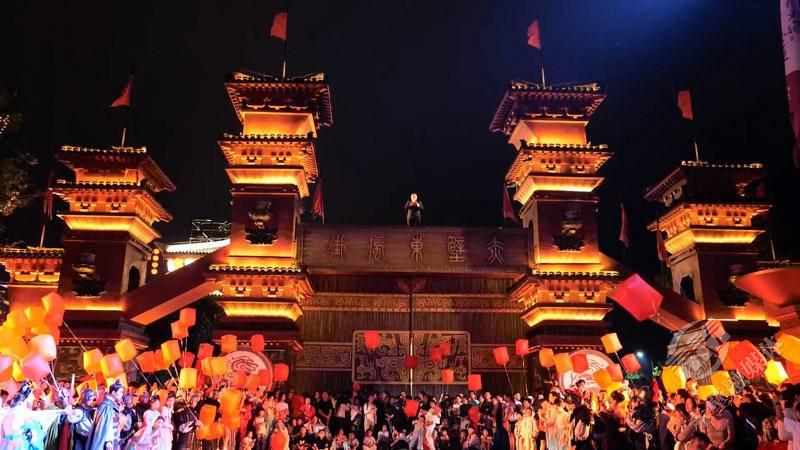 夜幕降临,赤壁古战场东风街灯火通明。随着战鼓擂响,1800年前的祈愿仪式重现。“诸葛亮”登临“七星祭坛”,击鼓诵文,为家国祈愿。随后在“诸葛亮”的带领下,近万名游客手持孔明灯,一同点亮放飞。刹那间,夜空被点点灯火映照得如梦似幻,仿佛千年前的东风再次吹来,将游客瞬间带入波澜壮阔的三国梦境。