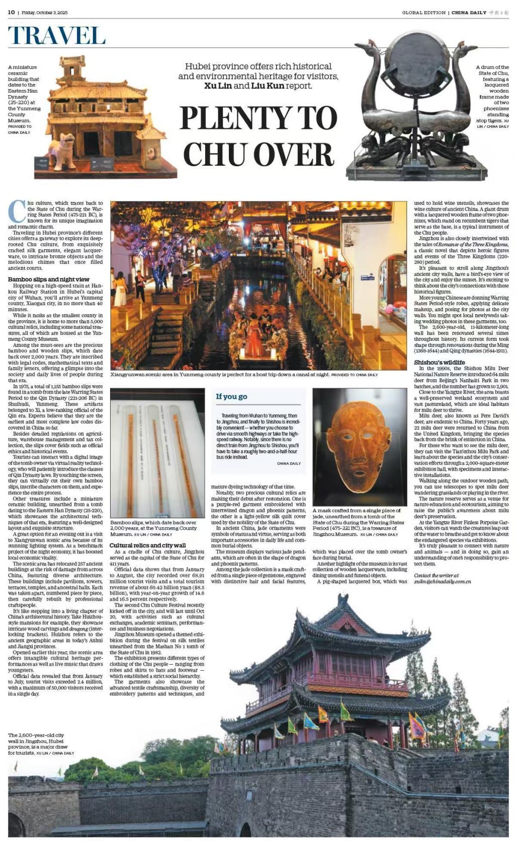 10月3日,中国日报10版刊登了《Plenty to Chu Over》一文。报道聚焦湖北,从云梦简牍、荆州的文物古城,到石首的野生动物保护区,处处可探寻楚文化的深厚底蕴与自然之美,为游客呈现了一场穿越历史与自然的文化盛宴,也为湖北文旅经济发展注入新动能。
