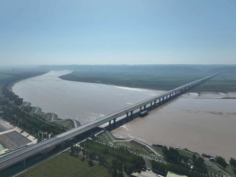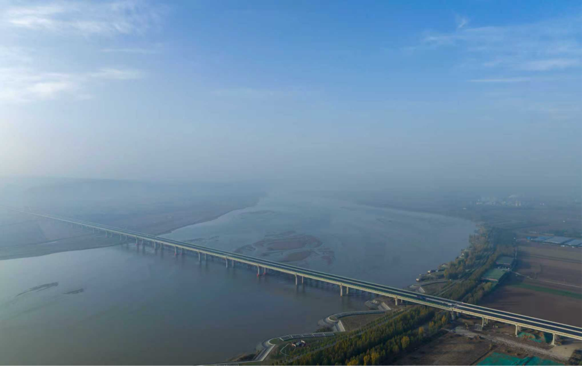 项目控制性工程黄河特大桥主桥全长2585米,采用双向六车道设计,设计时速120公里,是国内同类高速公路中设计时速最高的大型桥梁之一。大桥主梁为槽型钢混组合梁结构,采用国际上最先进的步履式顶推施工工艺,其中单向最大顶推距离达1285米,顶推单跨达到100米,是国内顶推距离最长、单跨顶推距离最大的桥梁之一。
