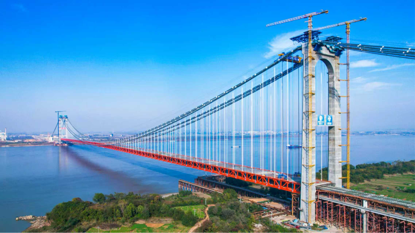 大桥全长约26千米,采用双层通行设计:上层为六车道高速公路,设计时速100公里;下层为四车道城市快速路,设计时速80公里。受花湖机场航空限高与长江通航需求双重约束,项目创新性采用世界首创不同垂度四主缆双层悬索桥结构体系,南岸主塔高度仅184米,垂跨比达1:15的千米级悬索桥罕见标准。通过优化同侧主缆的高度、长度与垂度参数,既有效分散荷载、提升桥梁稳定性,又合理控制索鞍及主缆规模,破解了低空高跨径桥梁建设的结构性难题。